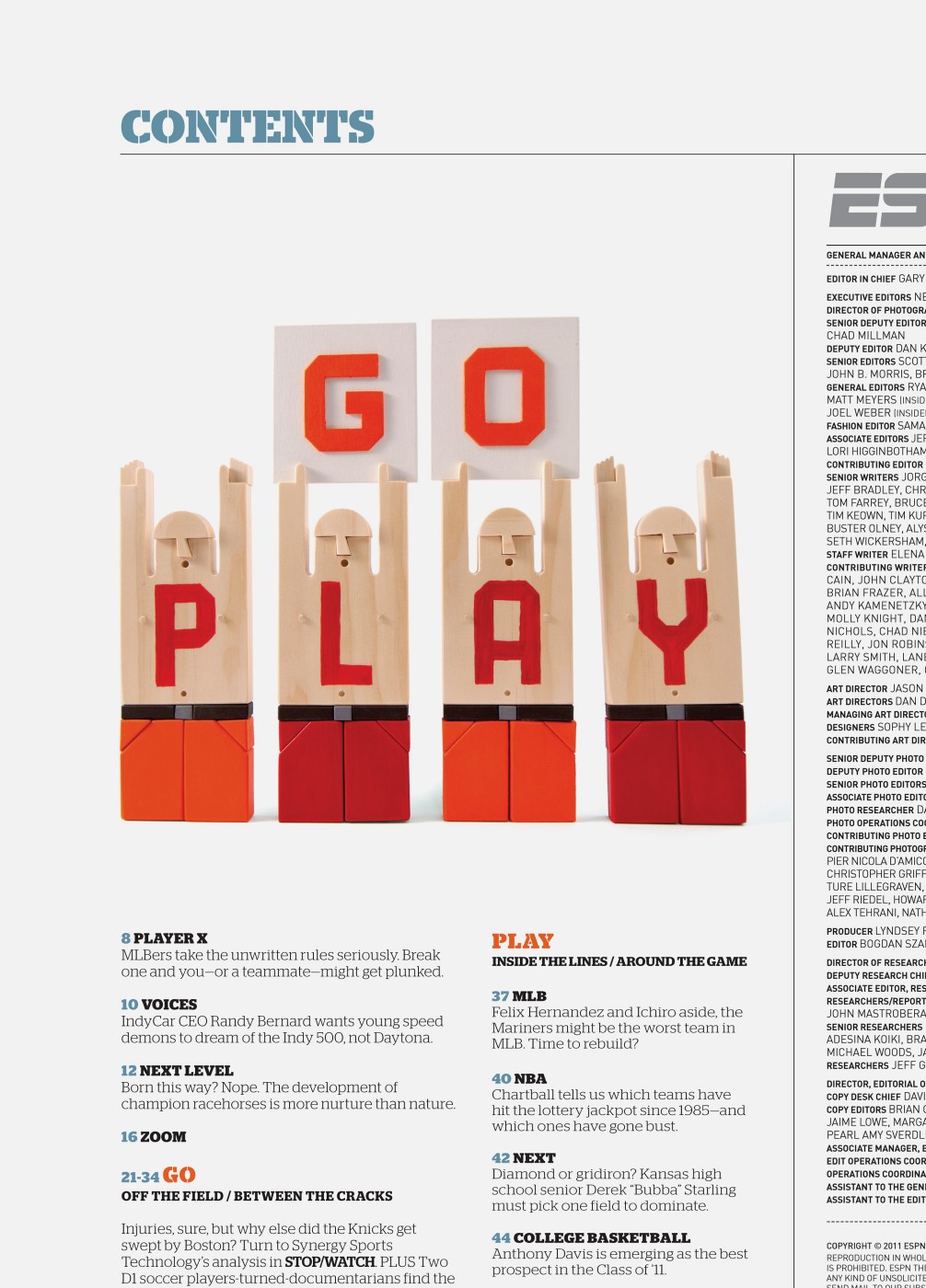 Table of contents illustration for ESPN Magazine. Cut wood. Illustration / Models / Photography: Todd St. John.