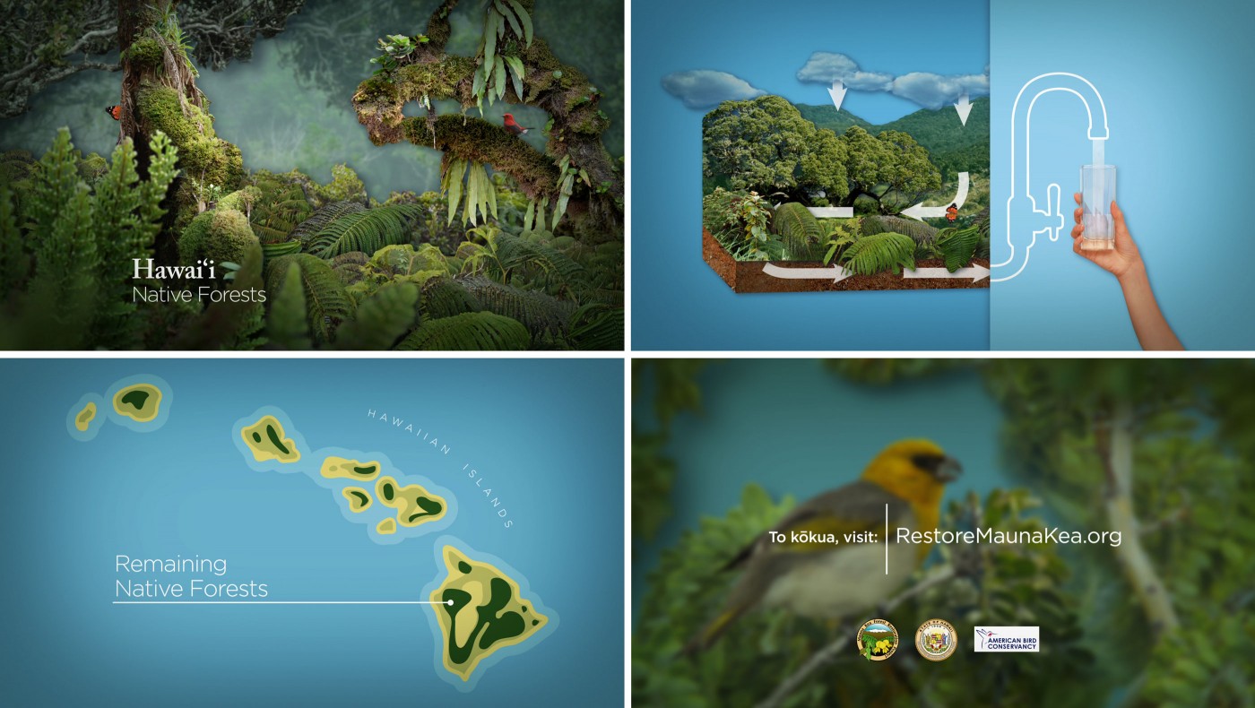 Hawaii’s Department of Land & Natural Resources reached out to us to develop a series of animated PSAs dedicated to conservation in Hawaii. The first introduces the endangered Palila: A native bird whose environment and existence is threatened by invasive plant and animal species. The second explains how preservation of Hawaii’s native forests is essential to maintaining the local watershed.