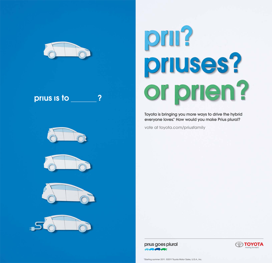 We collaborated with Saatchi & Saatchi LA on the Prius Goes Plural campaign, which introduced 3 new Prius models. The concept kicked off with two short animations encouraging people to vote for what the plural of Prius should be. Using Sesame-Street-style jingles, the animations explore the complicated nature of plurals.