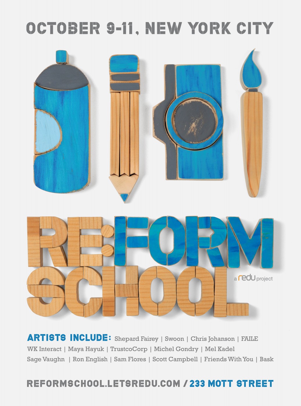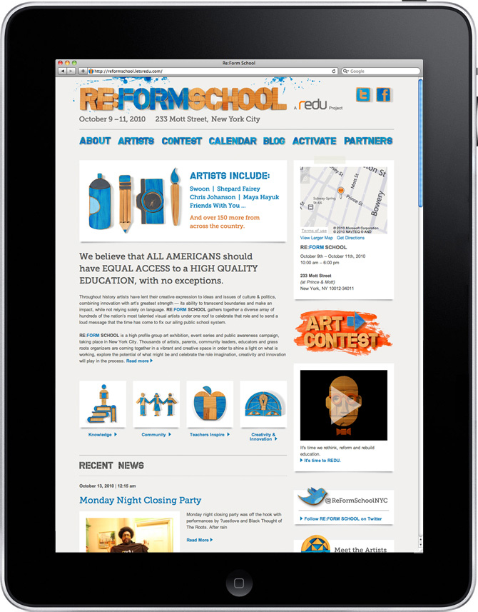 HunterGatherer created the identity, branding and event art direction for Re:Form School, a large art show and event series to benefit and raise awareness about education reform. The event was held in a former NYC elementary school in downtown Manhattan over 3 days, and brought together hundreds of artists like Swoon, Shepard Fairey, and Friends with You to bring attention to problems in the public education system and call for solutions.