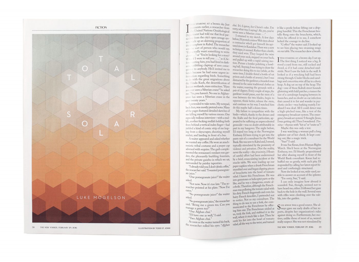 A New Yorker short story by Luke Mogelson in which a “slightly cynical journalist in Kabul is meeting with a United Nations researcher when there’s a sudden deadly attack.” Illustration: Todd St. John. Art Direction: Nicholas Blechman