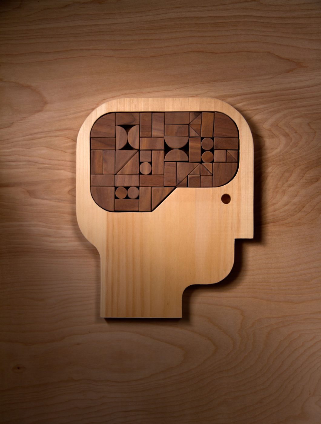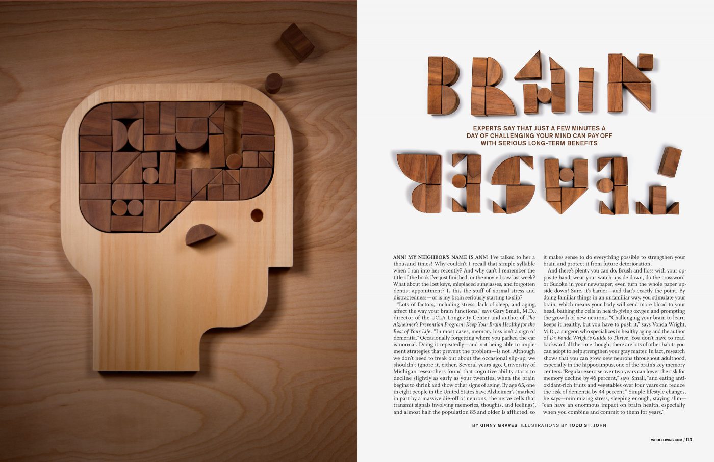 Hand-cut wood illustration for Whole Living magazine about the benefits of mental exercise. The pieces from inside the head came out and spelled the headline “Brain Teaser” with no wasted pieces. Illustration: Todd St. John.
